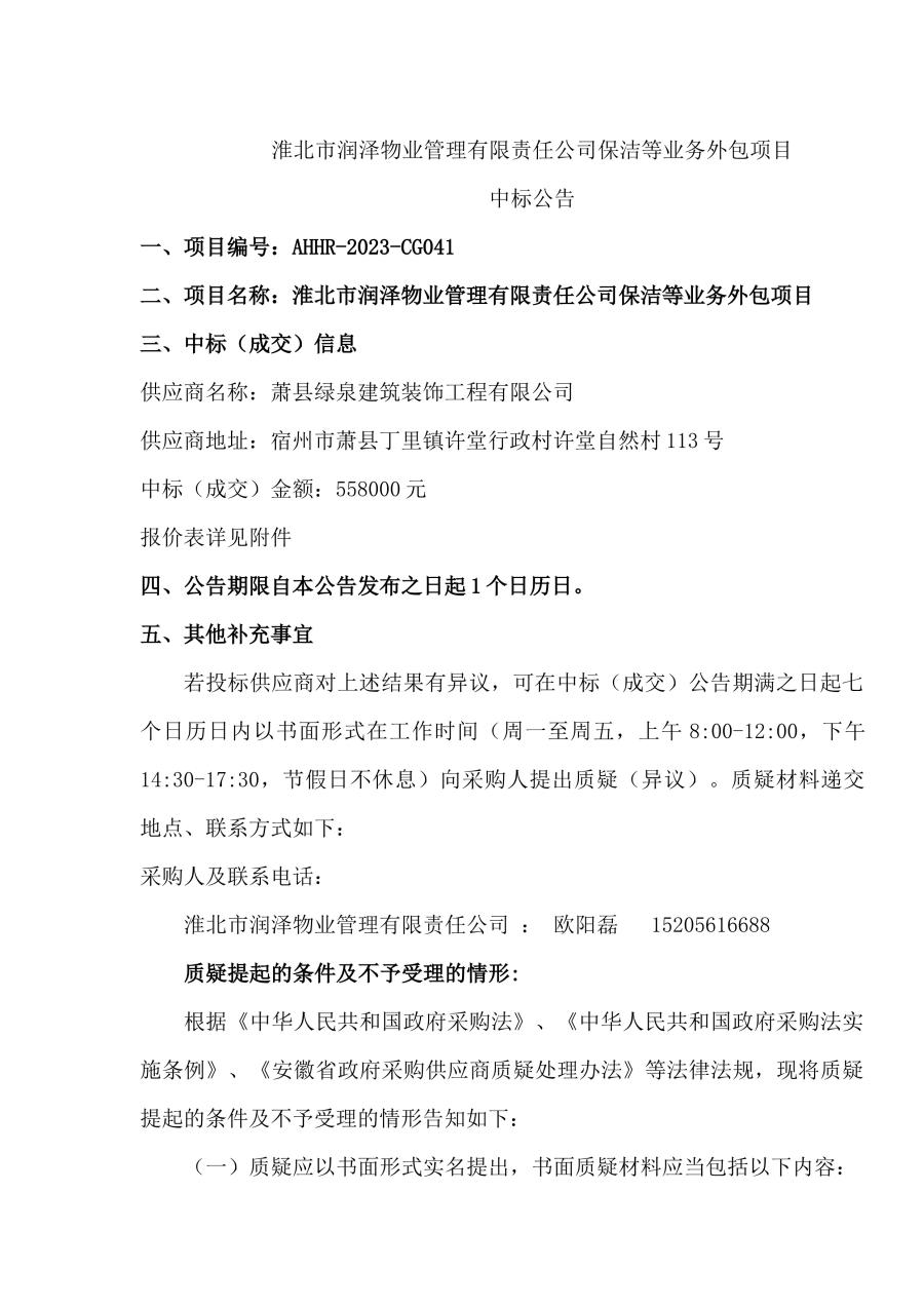 淮北市潤澤物業(yè)管理有限責任公司保潔等業(yè)務(wù)外包項目中標公告