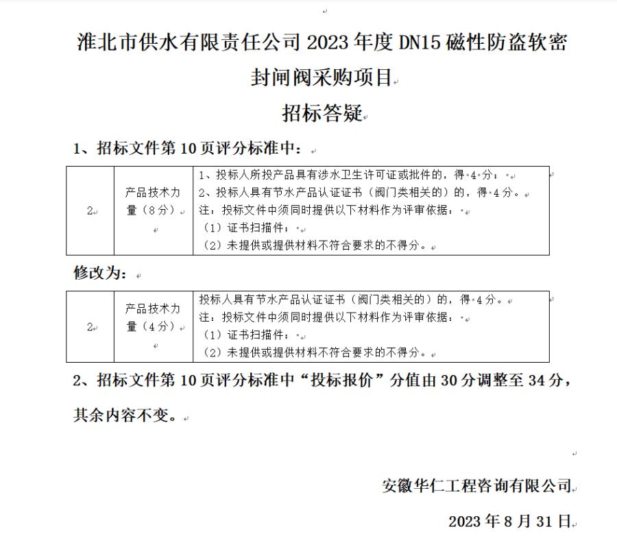淮北市供水有限責(zé)任公司2023年度DN15磁性防盜軟密封閘閥采購項目招標(biāo)答疑