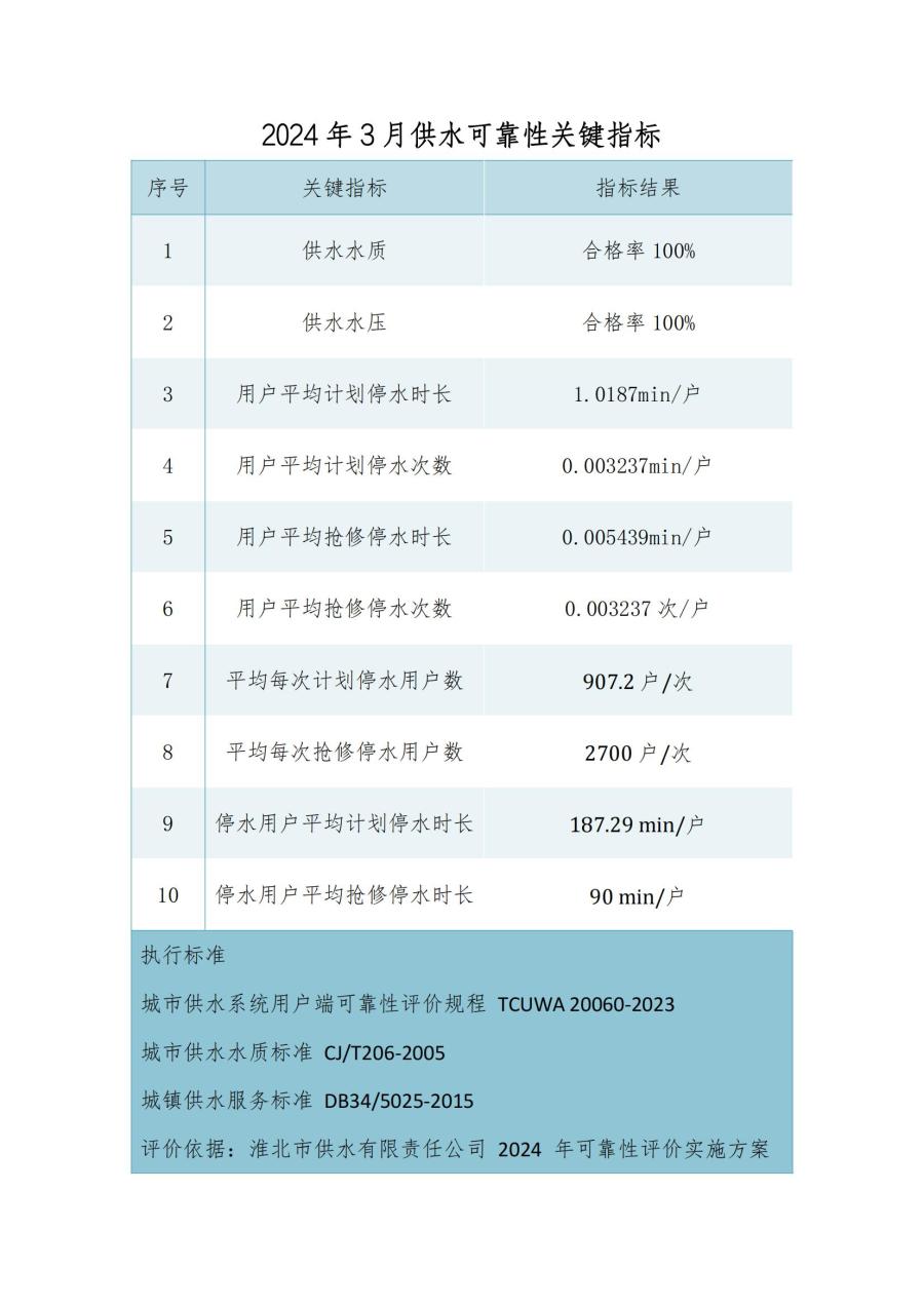 2024年度3月份淮北市供水可靠性關鍵指標